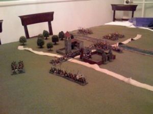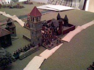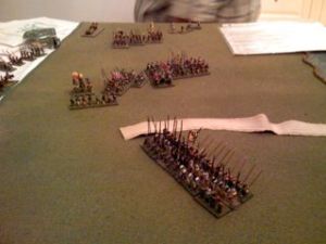 The Ubuntu also did a couple of strange things: they left the village completely undefended and did not lead with their 11 bowmen. In fact, the bows only got off 1 successful shot towards the end of the game! I called the game a draw in part because though the nearly wiped-out explorers got to the village and couldn’t realistically do much once they got there, since there was not a single Ubuntu figure in the village to oppose them I deemed that a gross tactical mistake.