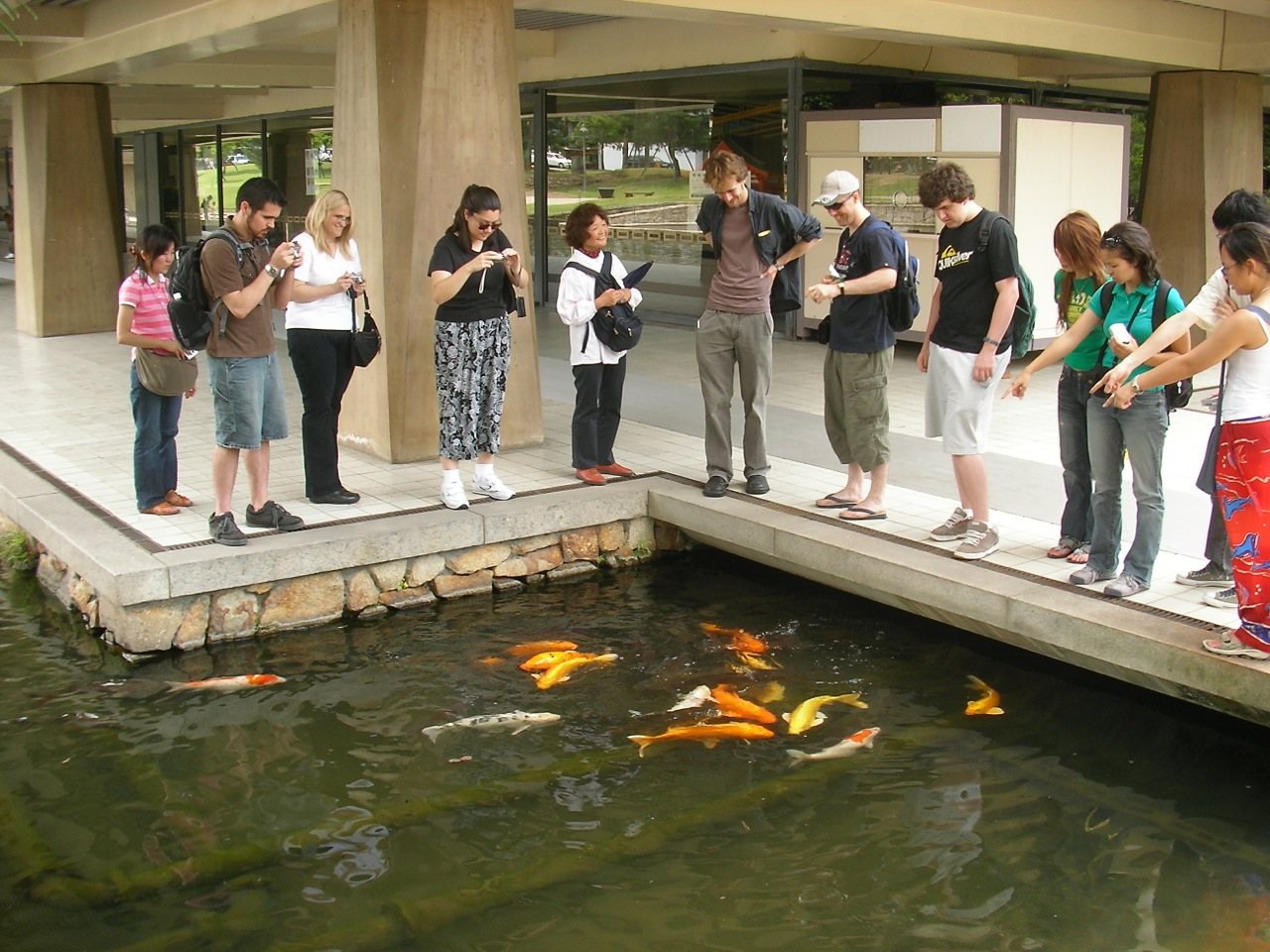 Minna-san and the Koi Published 2012-06-15 at 1280 × 960 in Gallery 2006: 奈良 Nara Walking Tour Minna-san and the Koi L to R: Kishi-sensei, Jeremiah, Leslie, Alia, our Tour Guide, Erick, Paul-san, Kevin, CP, Junko, Ryosuke (CP), Heather. Like Loading...